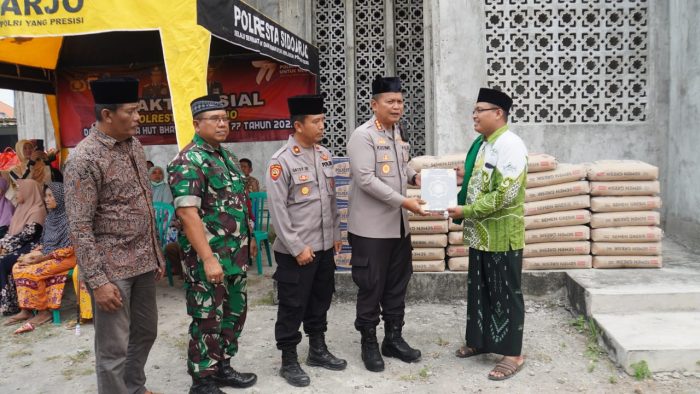 Guna menunjang kenyamanan masyarakat dalam menjalankan ibadah, Polresta Sidoarjo melaksanakan Gerebek Masjid Ar Ridho Jatikalang, Krian, pada Jumat (14/7/2023). Kepedulian pada tempat ibadah dilakukan dalam bentuk penyaluran bantuan bahan bangunan, Kitab Al Qur’an dan air mineral.