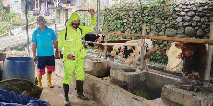 Dalam hal ini Polsek Kasembon Polres Batu bekerja sama dengan Dinas terkait menggencarkan penyemprotan disinfektan kepada hewan guna mengantisipasi penyebaran wabah PMK pada hewan ternak khususnya hewan sapi. Selasa, (12/7/2022)
