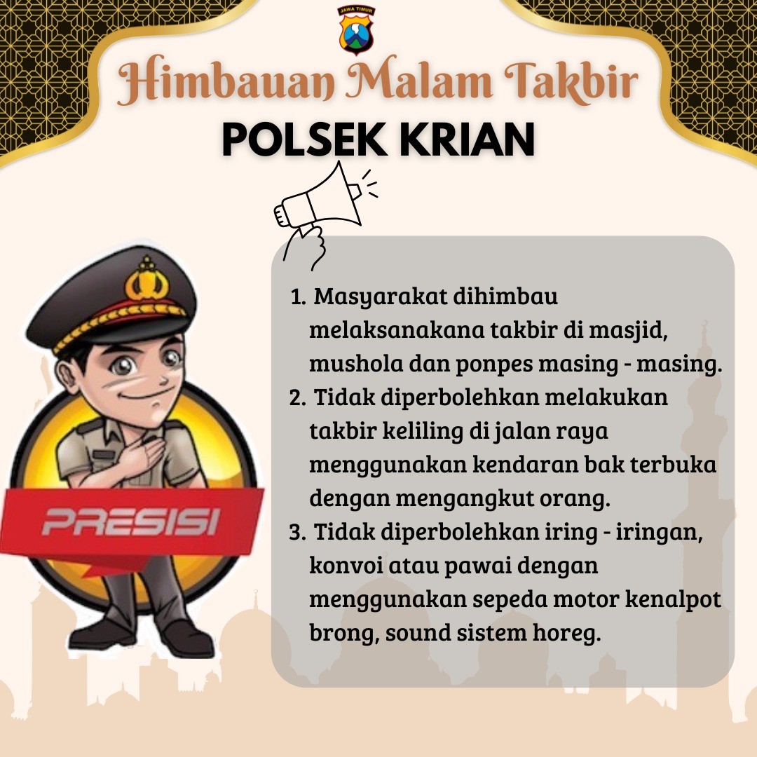 Lebih lanjut, Kapolsek Krian juga mengimbau warga untuk merayakan malam takbir dengan penuh khidmat di lingkungan masing-masing.