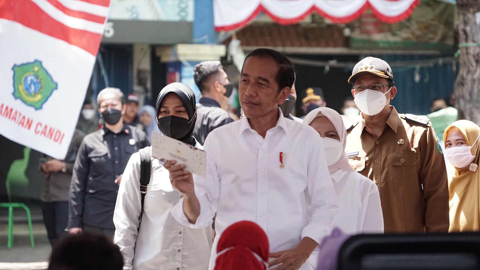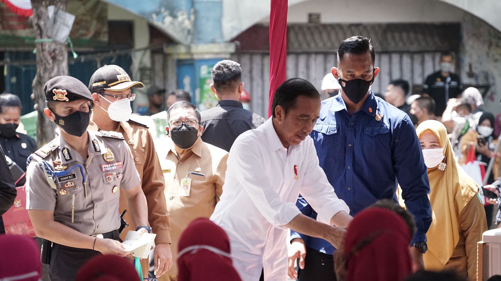 Ratusan pedagang dan pengunjung Pasar Larangan, Kecamatan Candi, Kabupaten Sidoarjo dibuat kaget dengan kedatangan Presiden RI ke-7. Kedatangan Presiden Jokowi beserta Ibu Negara Iriana Joko Widodo itu dalam rangka membagikan Bantuan Sosial (bansos) sekaligus menyapa para pedagang dan warga Sidoarjo. Senin, (22/8/2022).