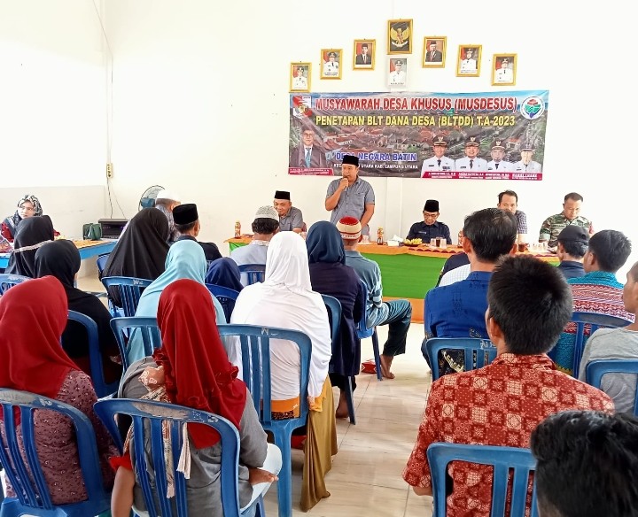 Pemerintah Desa (Pemdes), Negara Batin, Kecamatan Sungkai Utara, Kabupaten Lampung Utara, Gelar Musyawarah Desa Khusus Bantuan Langsung Tunai Dana Desa (Musdesus BLT DD) Tahun Anggaran 2023.