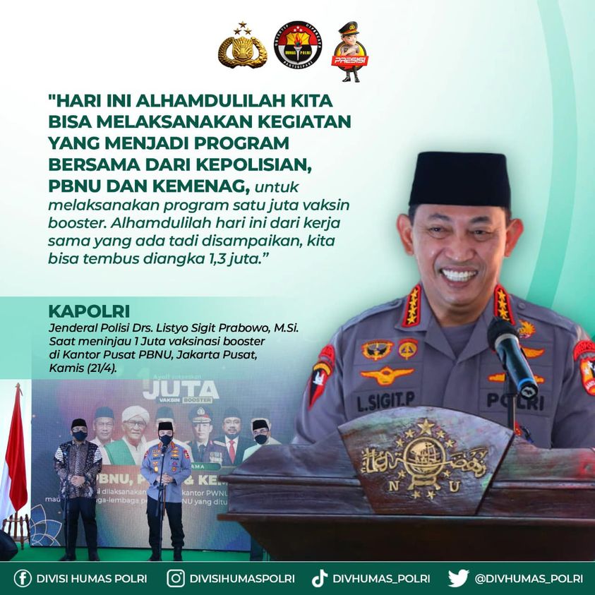 Kapolri Jenderal Polisi Drs. Listyo SIgit Prabowo, M.Si., meninjau pelaksanaan program 1 juta vaksin booster. Kegiatan yang digelar atas sinergi antara Polri, Kementerian Agama (kemenag) dan Pengurus Besar Nahdlatul Ulama (PBNU) ini dilaksanakan secara serentak di seluruh wilayah Indonesia. Dengan target masyarakat yang belum menerima vaksin dosis ketiga.