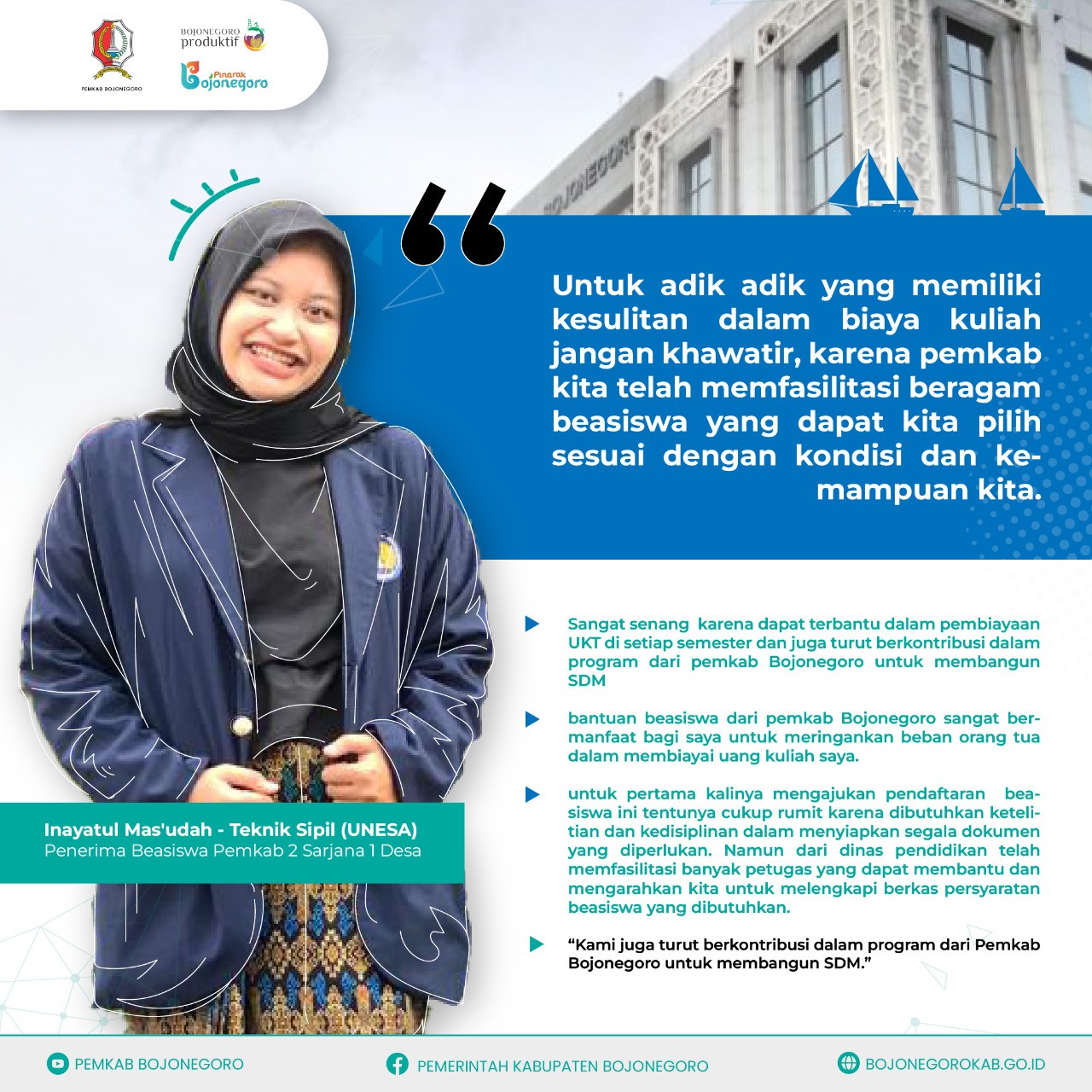 Ina, sapaan akrab perempuan 20 tahun ini mengaku sangat senang karena dapat terbantu dalam pembiayaan UKT di setiap semester. Bantuan beasiswa dari pemkab Bojonegoro sangat bermanfaat baginya untuk meringankan beban orang tua dalam membiayai uang kuliah.