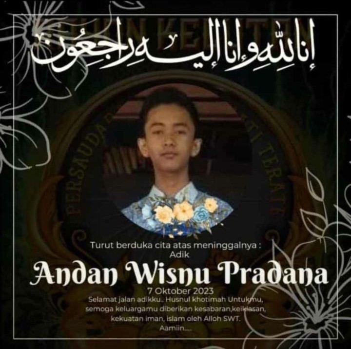 “Telah terjadi penganiayaan berat berujung meninggalnya Andan Wisnu Pradana hari Rabu 4 Oktober 2023, sempat dibawa ke RS namun nyawa tidak tertolong di Dermaga Brantas Kediri (siswa PSHT) saat pulag latihan di UNP. Apa harus viral dulu baru kepolisian bertindak tegas?” bunyi pesan tersebut.
