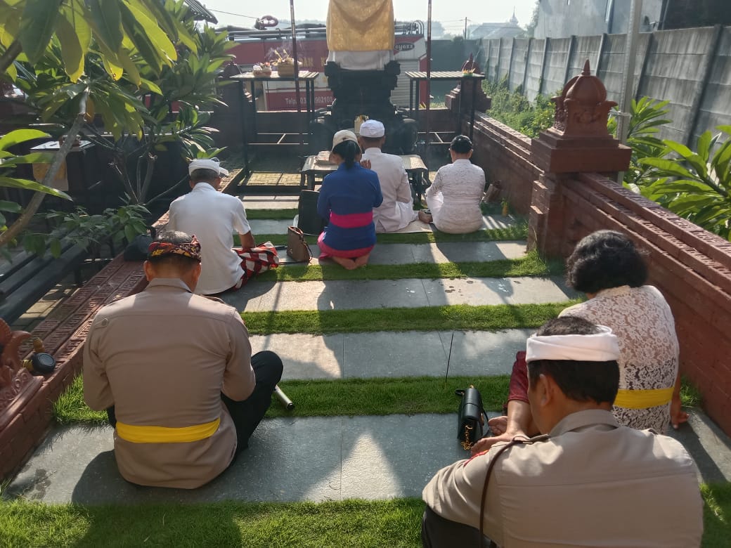 Kegiatan ibadah hari suci Tilem di Pura Kertha Bumi Bhayangkara dipimpin Pandite I Gusti Agung Mertayasa. Sementara Pengurus Pura Iptu I Gede Budayasa bersyukur atas terlaksananya ibadah ini.