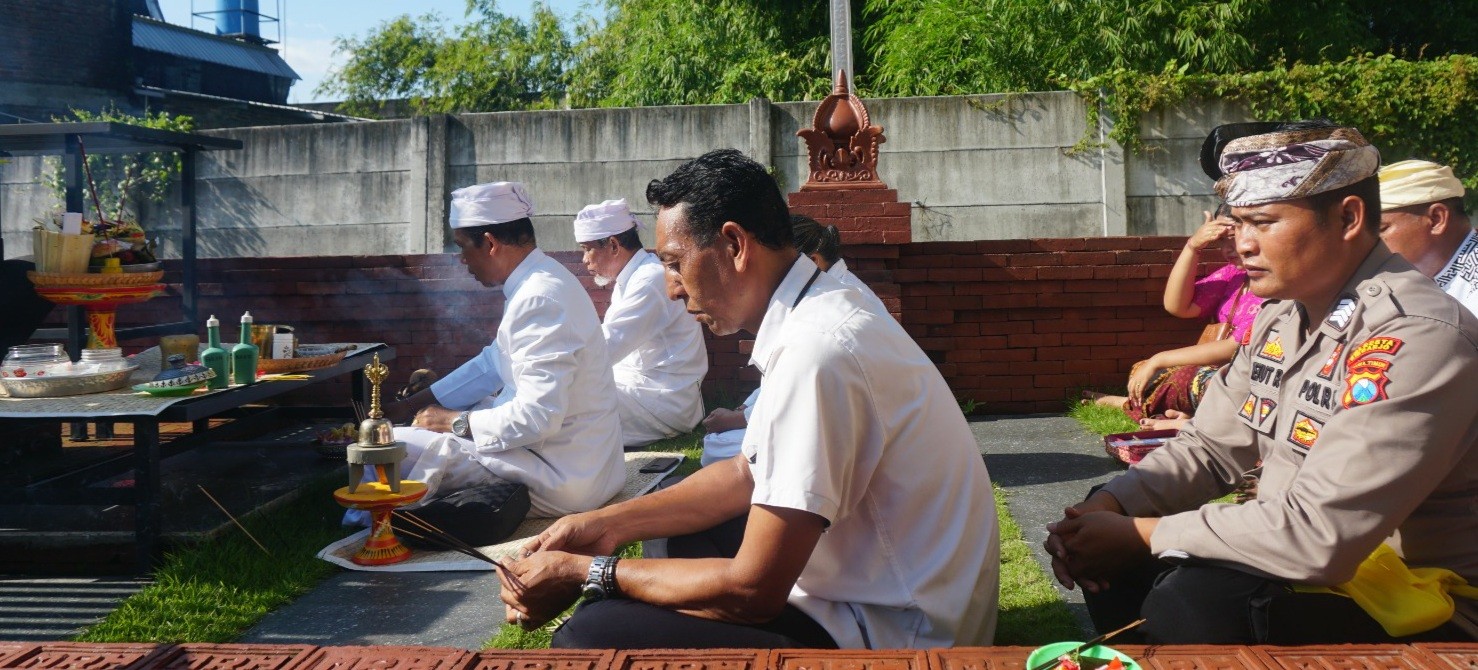 Anggota Polresta Sidoarjo, polsek jajaran beragama Hindu beserta keluarga dan umat Hindu di sekitar Mako Polresta Sidoarjo, Senin (20/2/2023), melaksanakan ibadah Hari Suci Tilem di Pura Kertha Bumi Bhayangkara.