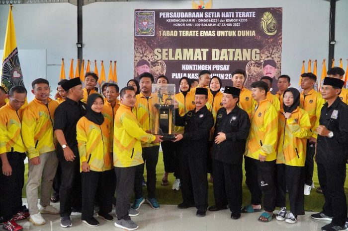 Bertempat di Graha Krida Budaya Padepokan Agung SH Terate, Jl. Merak No. 17, Kelurahan Nambangan Kidul, Kecamatan Manguharjo, Kota Madiun, Jawa Timur, Kamis (01/6/2023). Ketua Umum Persaudaraan Setia Hati Terate (PSHT) Pusat Madiun, Drs. R. Moerdjoko HW didampingi Dewan dan pengurus pusat menyambut gembira kedatangan para atlet-atlet yang telah berhasil meraih juara Umum kategori Remaja, 12 medali emas, 6 perak dan 4 perunggu di ajang kejuaraan terbuka Pencak Silat Piala Kasad Ke-1 tahun 2023.