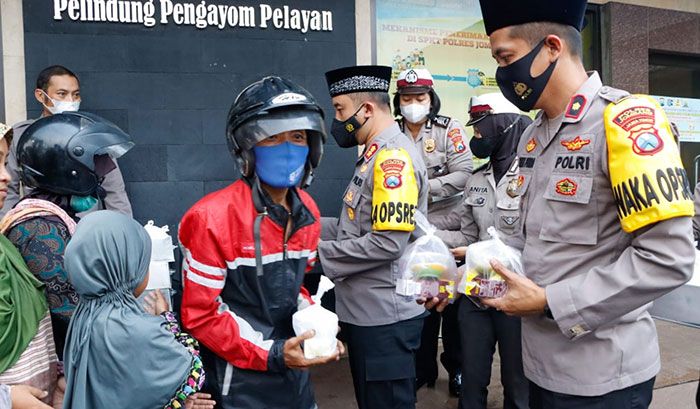 Polres Jombang membagikan takjil kepada masyarakat atau pengendara saat Ramadan 1443 H. Kudapan siap santap itu dibagikan bagi mereka yang melintas di depan Mapolres Jombang.