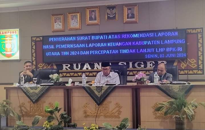 Sekretaris Daerah (Sekda) Kabupaten Lampung Utara, Drs. Lekok, MM., memimpin rapat penyerahan surat Bupati atas rekomendasi laporan hasil pemeriksaan (LHP) laporan keuangan Kabupaten Lampung Utara tahun 2023 dan percepatan tindak lanjut LHP BPK RI serta kegiatan Monitoring, Control, and Prevention (MCP) dan Satuan Pengawas Internal (SPI) KPK. (3/6/2024)