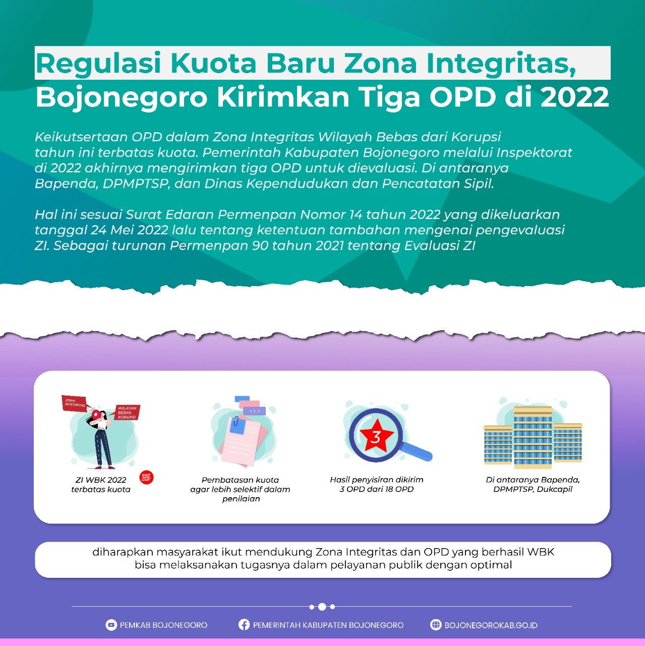 Keikutsertaan OPD dalam Zona Integritas Wilayah Bebas dari Korupsi tahun 2022 ini dibatasi kuota. Pemerintah Kabupaten Bojonegoro melalui Inspektorat akhirnya mengirimkan tiga OPD untuk dievaluasi. Di antaranya Bapenda, DPMPTSP, dan Dinas Kependudukan dan Pencatatan Sipil.