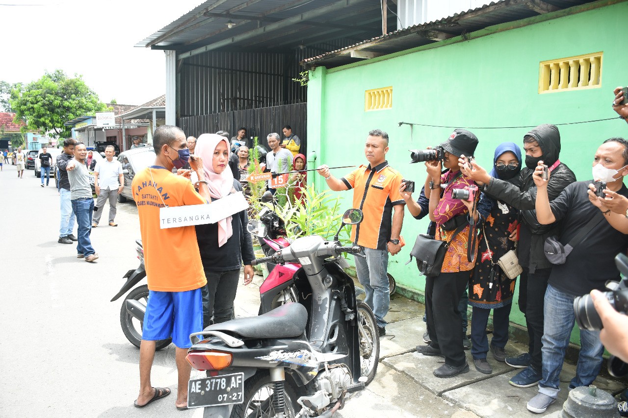 Satuan Reskrim Polres Madiun Kota Polda Jatim menggelar rekontruksi kasus pembunuhan dengan tersangka berinisial I.S (46) dan korban berinisial YR (44) istri sirinya warga Desa Sambirejo, Kecamatan Jiwan, kejadian pembunuhan terjadi pada Rabu(21/12) di Jalan Niti Kusumo Kelurahan Demangan Kecamatan Taman Kota Madiun.