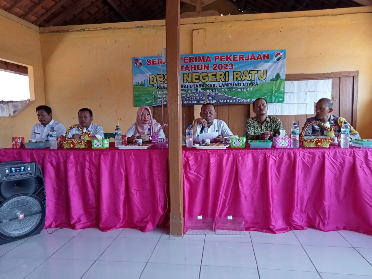 Dipenghujung acara tersebut Pemdes Negeri ratu menggelar acara, Serah terima pekerjaan fisik ketahanan pangan tahun anggaran 2023, Yang telah lama selesai 100%, yang diserahkan oleh TPK desa, dan kepala desa, kepada masyarakat yang diwakili oleh BPD, yang dibuka oleh camat sungkai utara, Antono Efendi, dan disaksikan oleh masyarakat, BPD Negeri ratu, Lpm, pkk, pendamping desa, pendamping kecamatan, bhabinsa, bhabinkamtibmas, dan masyarakat setempat.