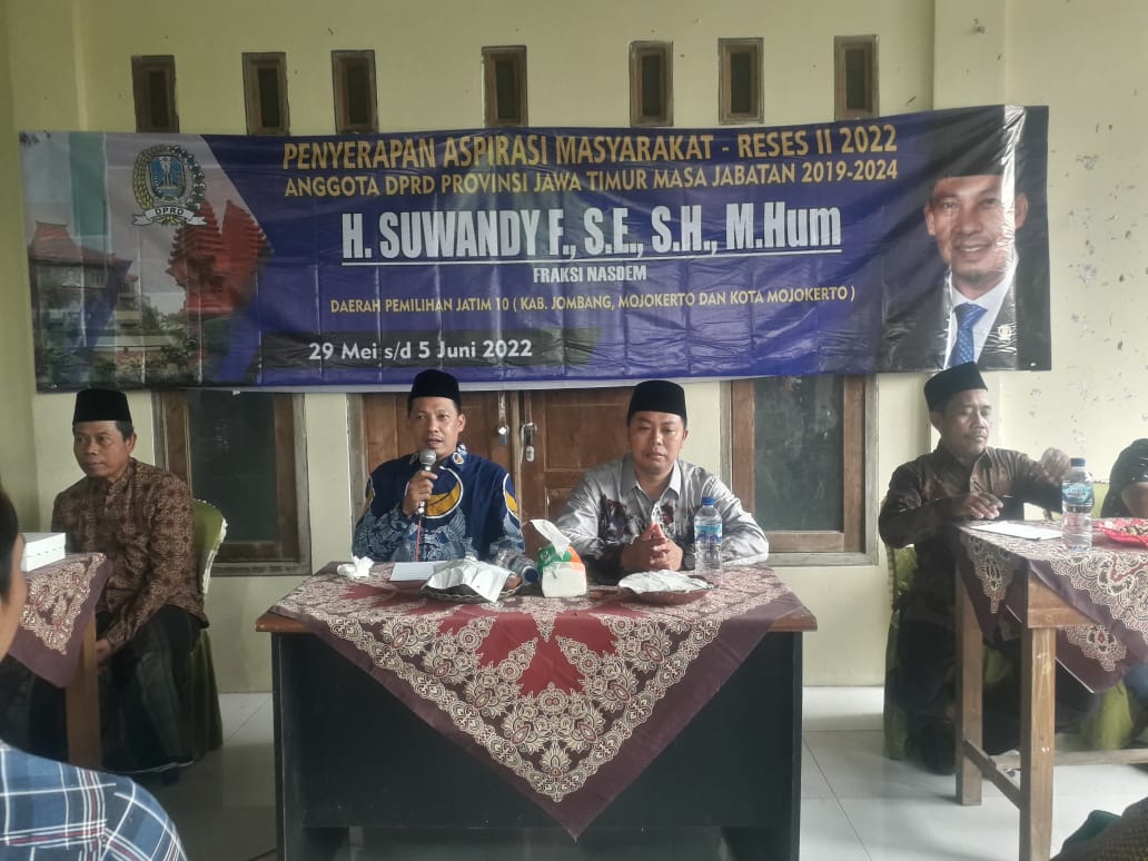 Anggota DPRD Provinsi Jawa Timur dari Fraksi NasDem, H. Suwandy Firdaus, SE, SH, M.Hum mengelar Serap Aspirasi Masyarakat ( Reses ) II Tahun Anggaran 2022 yang digelar Minggu ( 29 / 05 / 2022 ) bertempat di Balai Dusun Bangeran Desa Bangeran Kecamatan Dawarblandong Kabupaten Mojokerto.