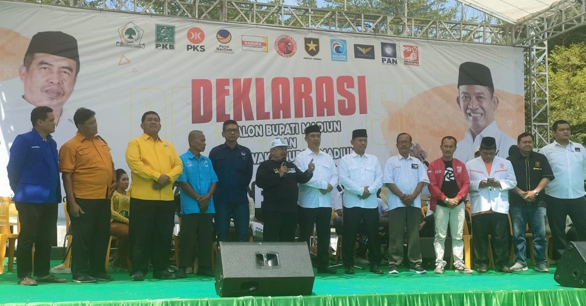Deklarasi pasangangan HARMONIS Hari Wuryanto dan Purnomo Hadi sebagai bakal calon Bupati dan Wakil Bupati Kabupaten Madiun untuk Pilkada 2024 berlangsung meriah di lapangan pendopo yang merupakan rumah tingal Hari Wuryanto Desa Mojopurno Kecamatan Wungu Kabupaten Madiun pada Rabu (28/8/2024). Ribuan pendukung hadir memadati lapangan hingga area perumahan,ini menunjukkan antusiasme yang luar biasa.