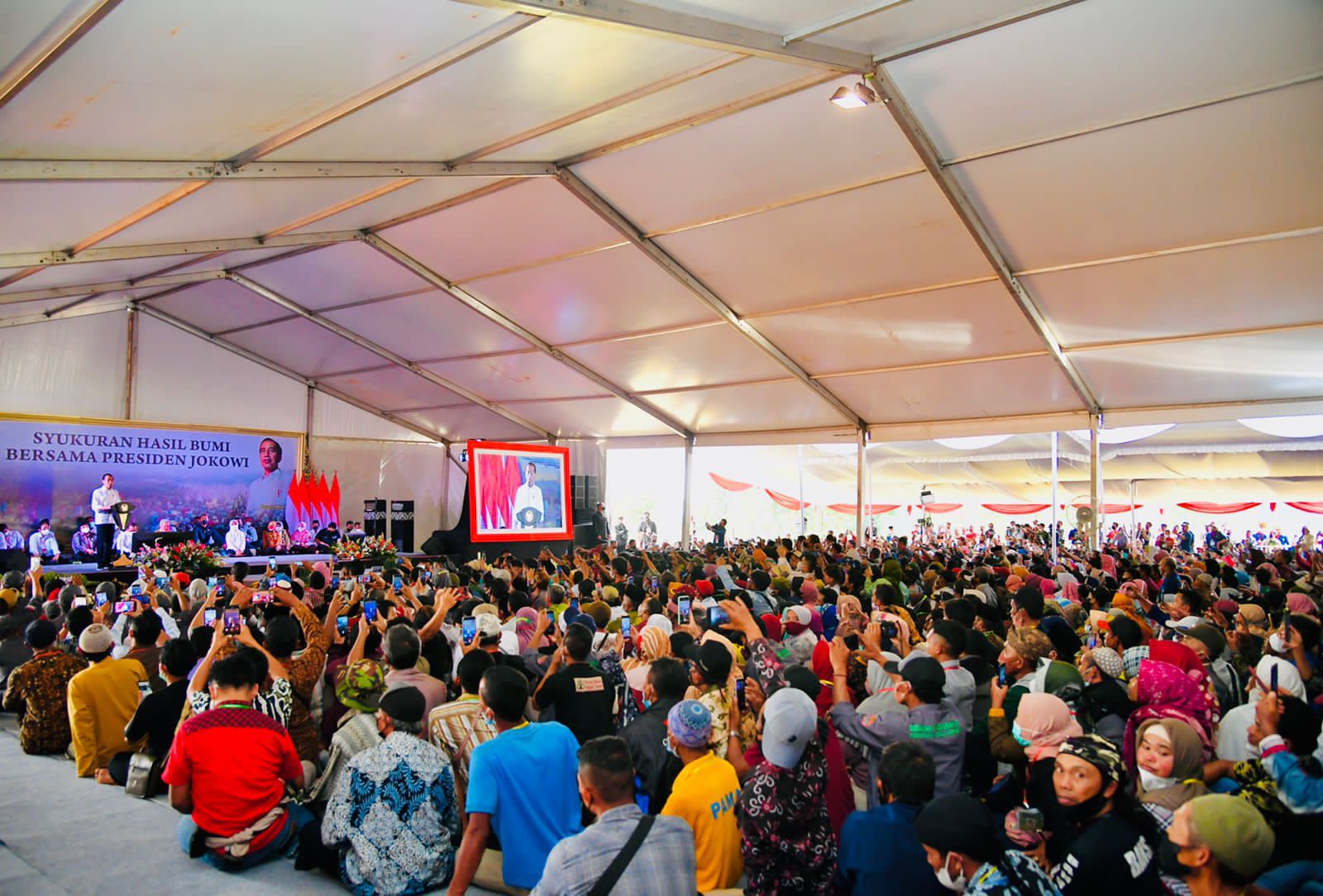 “Ribuan petani yang wajahnya terlihat bahagia, terlihat sumringah, gembira dan ceria. Karena petani sekarang sudah bisa tidur nyenyak. Petani sekarang sudah bisa nggarap lahan dan bertani tenang bahkan sudah bisa panen, alhamdulillah hasil-hasil panen dibawa juga ke sini,” ujar Siti.