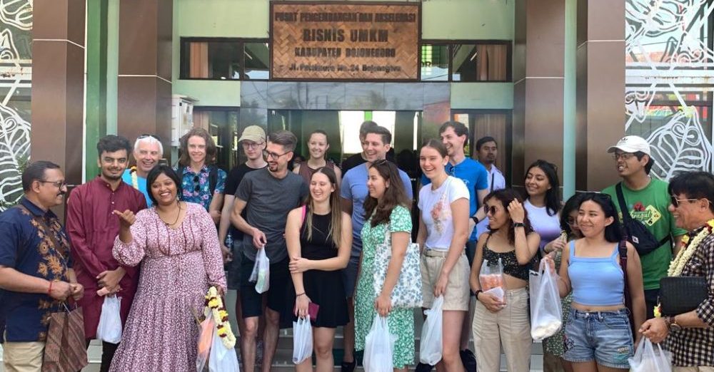 Di halaman gedung, berjajar para pelaku ekonomi kreatif yang dengan semangat menyambut para delegasi dari empat negara (Slovenia, India, Uzbekistan, dan Mexico). Mereka dengan bangga memamerkan beragam produk unggulan, mulai dari oleh-oleh khas Bojonegoro berupa ledre, mie pangsit buah melon, hingga keindahan batik daun eco print dan batik tulis yang memukau.