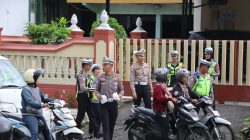 Selain membagikan brosur, personel Sat Lantas juga melaksanakan sosialisasi himbauan tentang kamseltibcar pada peserta apel pagi ini.