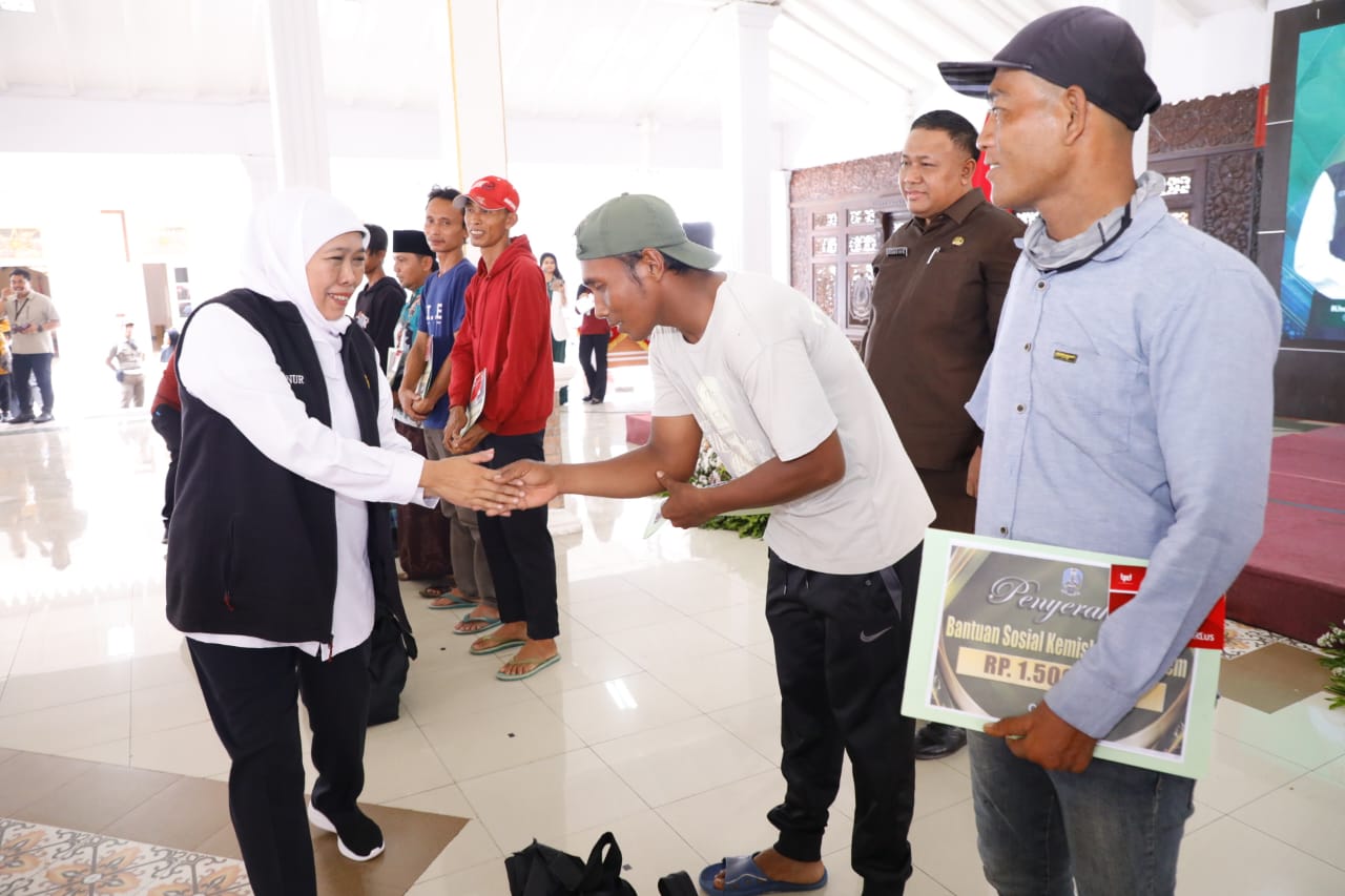Gubernur Jawa Timur, Khofifah Indar Parawansa, turun menyalurkan bansos di Pendopo Nyawiji Ngesti Wenganing Gusti, Kabupaten Pasuruan. | Foto: Ist