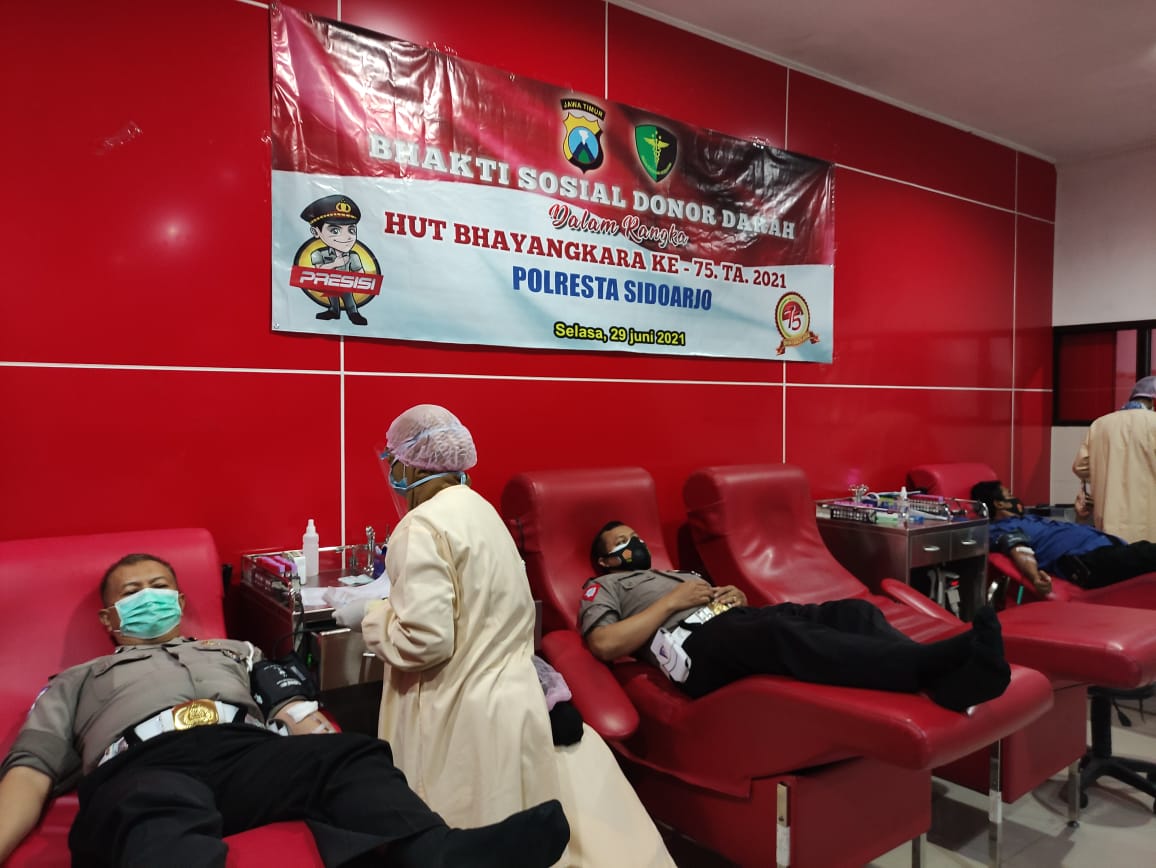 Kapolresta Sidoarjo AKBP Kusumo Wahyu Bintoro menyampaikan, bakti sosial donor darah kali ini adalah merupakan bakti Polri bagi masyarakat dalam rangka memperingati Hari Bhayangkara ke-75 tahun 2021. Bakti sosial donor darah yang dilakukan Polresta Sidoarjo, juga sebagai kepedulian Polri memperingati Hari Donor Darah Sedunia 14 Juni 2021 lalu.