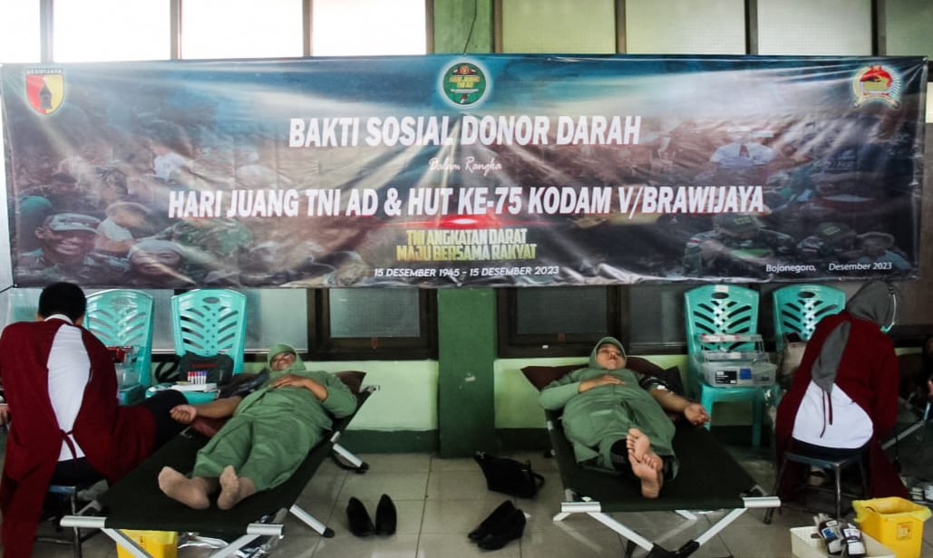 Dalam rangka menyambut Hari Juang TNI Angkatan Darat (AD) ke- 78 dan Hari Ulang Tahun (HUT) ke- 75 Kodam V Brawijaya tahun 2023, Kodim 0813 Bojonegoro bersinergi dengan Palang Merah Indonesia (PMI) Cabang Bojonegoro, menggelar kegiatan bakti sosial donor darah di Gedung Ahmad Yani Makodim setempat, Rabu (13/12/2023).