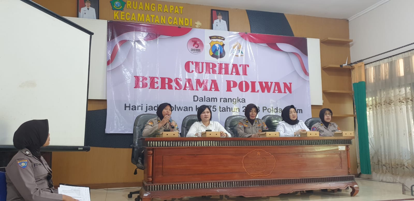 Kegiatan Curhat Bersama Polwan Polda Jatim yang dihadiri Polwan Polda Jatim, Polwan Polresta Sidoarjo, Ketua TP PKK Se-Kecamatan Candi, Kepala Desa wanita di wilayah Kecamatan Candi, perwakilan BPD, Fatayat dan muslimat wilayah Kecamatan Candi, perwakilan ormas dan beberapa undangan lainnya ini diadakan dalam rangka menyambut Hari Ulang Tahun (HUT) Polwan Republik Indonesia ke-75 tahun 2023.