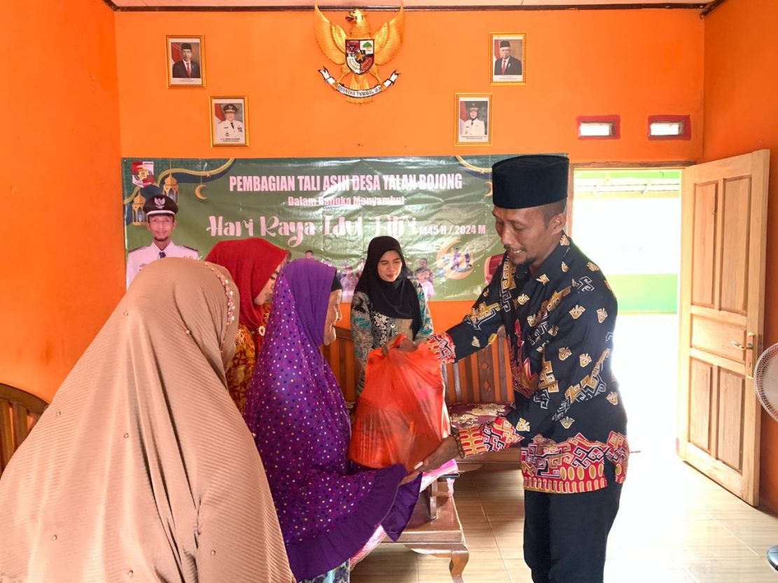 Menyambut Hari Raya Idul Fitri 1445.H, kepala Desa Talang Bojong, Edi Sumantri Bersama Apatatur Desa, Bagikan 50 Paket Sembako kepada masyarakat kurang mampu di desa Talang Bojong, Kecamatan Kotabumi, Kabupaten Lampung Utara.