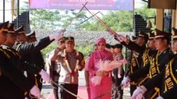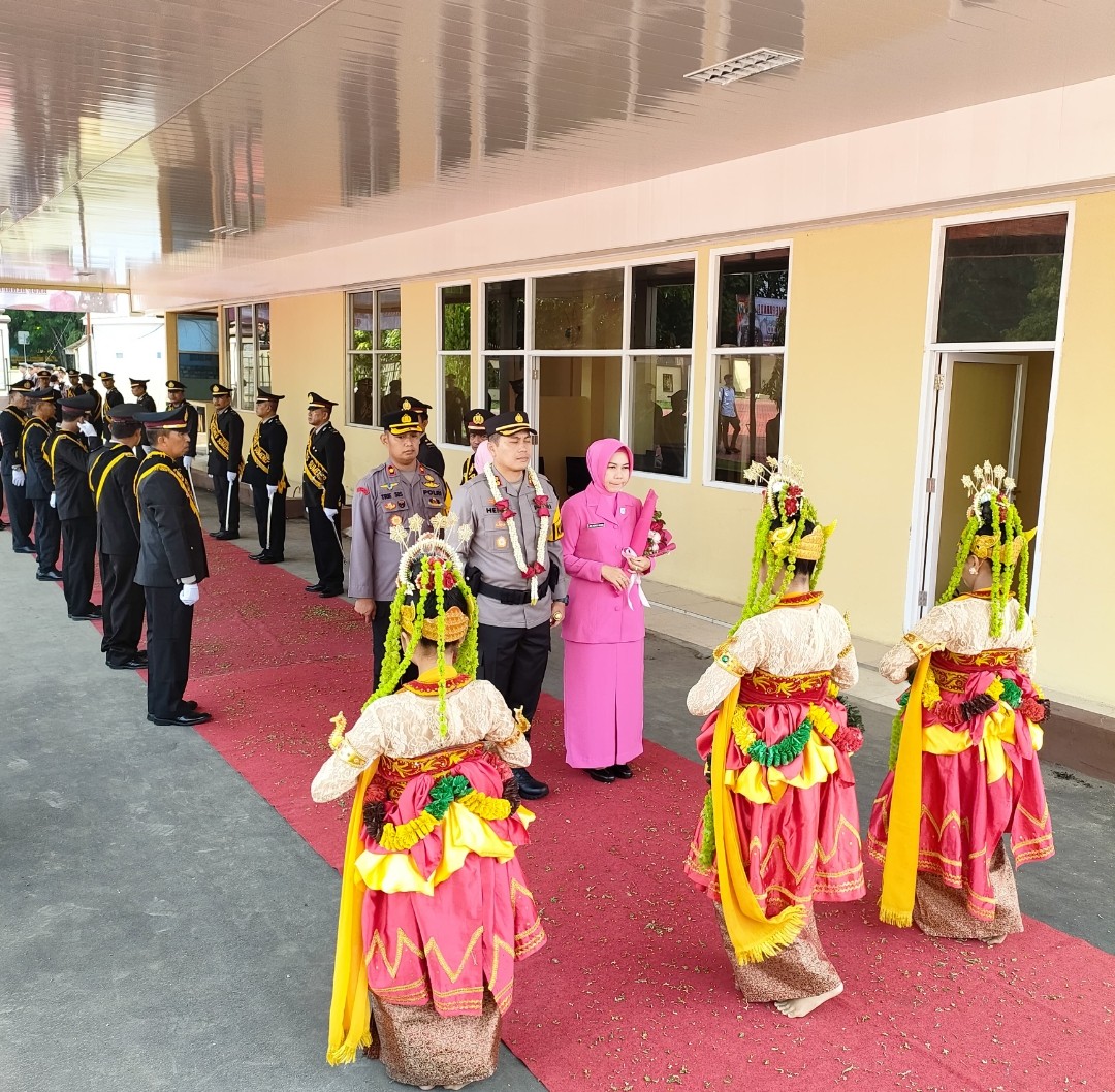 Saat memasuki gerbang Mapolres Sumenep, Kapolres Henri Noveri Santoso,. SH,. SlK., MM., bersama istri disambut dengan pengalungan bunga oleh Wakapolres sumenep yang dilanjutkan memasuki gerbang pora.