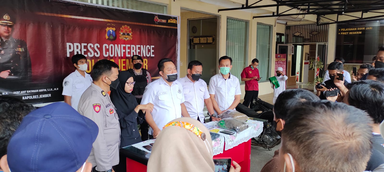 Press Release yang dilaksanakan oleh Sat Reskrim, bertempat di halaman Mako Polres Jember, terkait kasus tindak pidana barang siapa dengan sengaja menghilangkan nyawa seseorang dan atau dengan sengaja menganiaya seseorang sampai menyebabkan kematian seseorang, Selasa (21/12).
