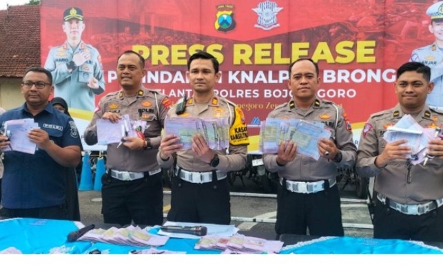 Satuan Lalu Lintas (Satlantas) Polres Bojonegoro, Polda Jawa Timur, menggelar konferensi pers, guna menyampaikan terkait penindakan knalpot brong atau yang tidak sesuai dengan spektek jalan.