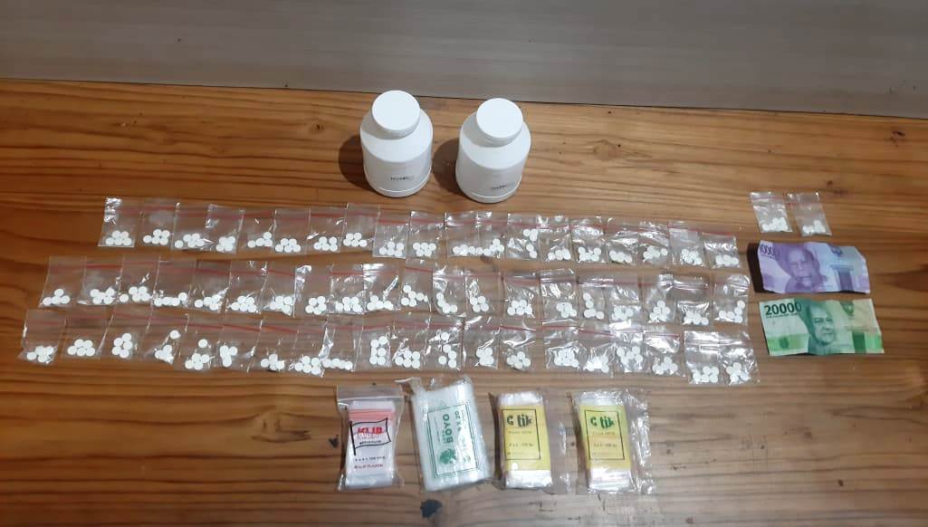 Barang bukti yang disita sebanyak 305 butir Pil Trex dengan rincian, 2 bungkus berisi 40 plastik klip masing-masing berisi 5 butir pil trex total 200 butir, 1 bungkus berisi 19 plastik klip masing-masing berisi 5 butir pil trex total 95 butir, dan 2 plastik klip berisi masing-masing 5 butir pil Trex, 2 botol plastik warna putih dan uang tunai hasil penjualan Rp. 30.000.