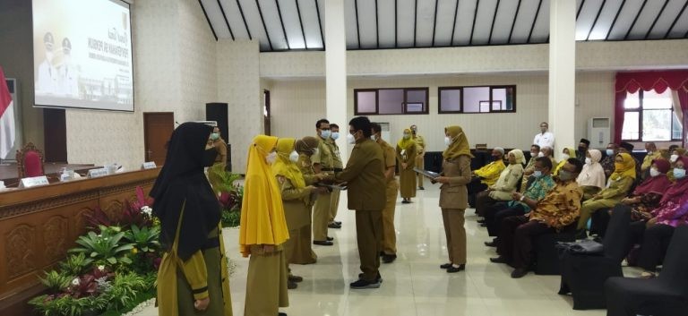 Sekda Jember menyerahkan 101 Piagam dan SK Pensiun Pegawai Negeri Sipil di Pendopo Jember Wahyawibawagraha, Selasa (12/10/2021).