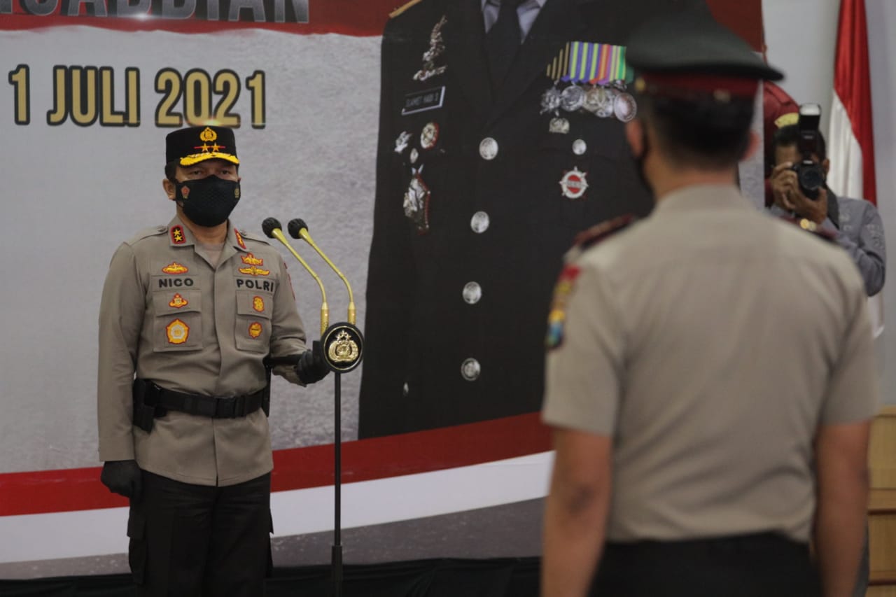 Kapolda Jatim Irjen Nico Afinta, menggelar pelaksanaan upacara Kenaikan Pangkat Reguler dan Pengabdian Anggota Polri Periode 1 Juli 2021. Kegiatan ini berlangsung di Rupatama Mapolda Jatim, Kamis (1/7/2021) pagi.