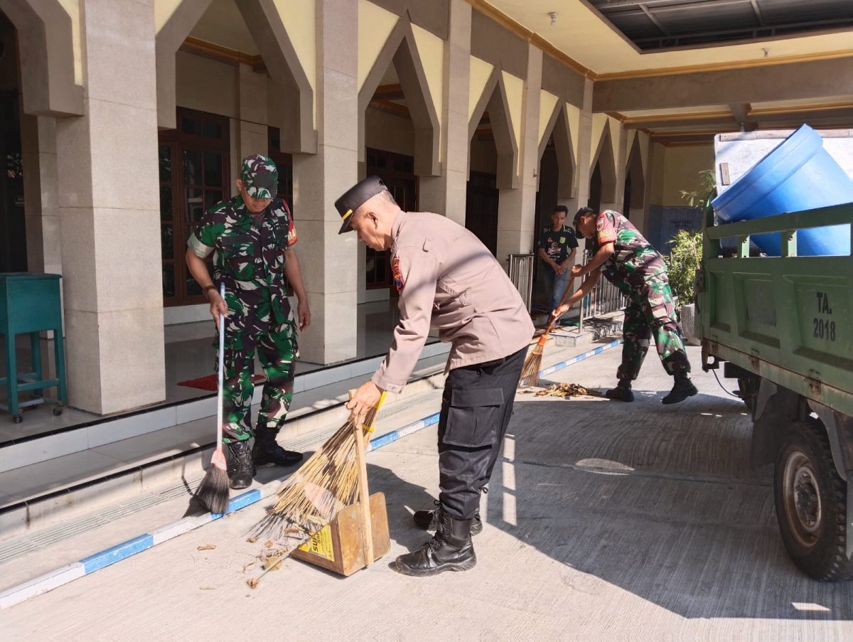 Sinergitas tiga pilar turun langsung peduli kebersihan dan kenyamanan masyarakat dalam ibadah, dilakukan personel Polsek Krembung, Koramil Krembung bersama perangkat desa setempat.