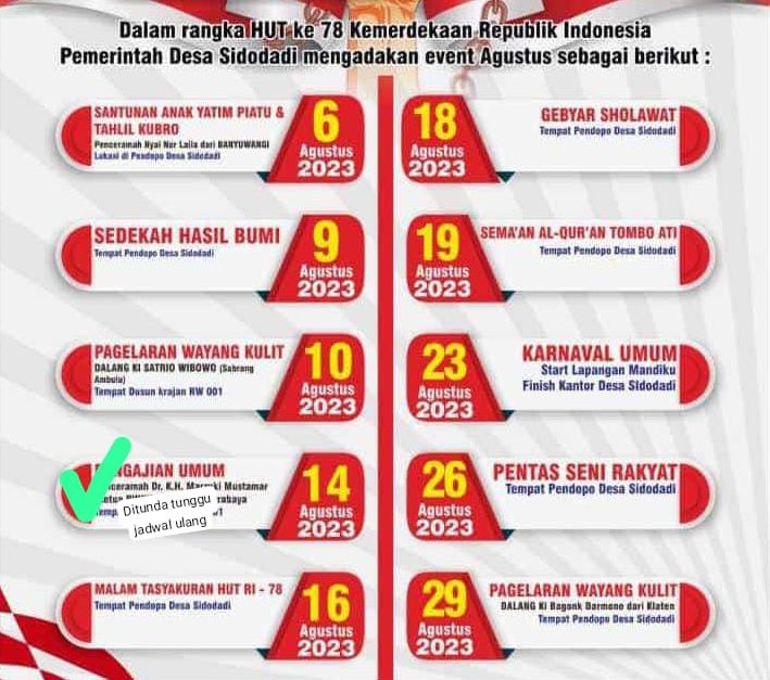 Rangkaian acara rutin tahunan dalam rangka menyambut Hari Ulang Tahun kemerdekaan RI ke 78 tahun 2023, Desa Sidodadi Kec. Tempurejo Kab. Jember gelar berbagai rangkaian acara. Acara dikemas dalam tajuk Sidodai Nduwe Gawe.