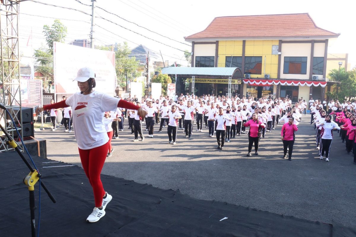 Polres Bojonegoro menggelar olahraga bersama dalam rangka menyemarakan Hari Kemerdekaan Republik Indonesia (RI) Ke-79, menyambut Hari Jadi Polisi Wanita (Polwan) ke-76 dan Hari Kesatuan Gerak Bhayangkari (HKGB) yang ke-72 Tahun 2024 di halaman Mapolres Bojonegoro, jum’at (16/8/2024).