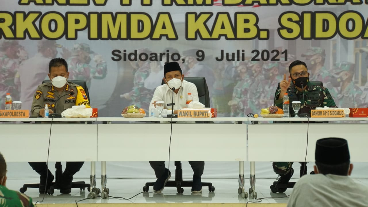 Pemberlakuan Pembatasan Kegiatan Masyarakat (PPKM) Darurat Jawa-Bali sudah tujuh hari berjalan, untuk mengevaluasi apa yang kurang dan bagaimana upaya selanjutnya dilakukan guna keberhasilan menekan penyebaran Covid-19, Forkopimda Sidoarjo melakukan anev PPKM Darurat.