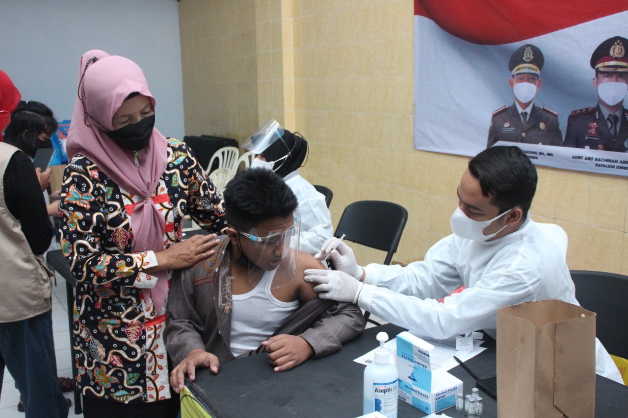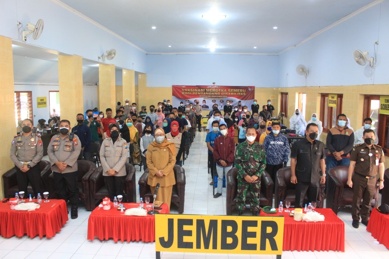 Program vaksinasi tengah berjalan hampir di seluruh wilayah Kecamatan di Kabupaten Jember. Polres Jember terus mendukung akselerasi vaksinasi, tidak hanya bagi masyarakat umum, lansia, tetapi juga berhak diberikan kepada penyandang disabilitas.