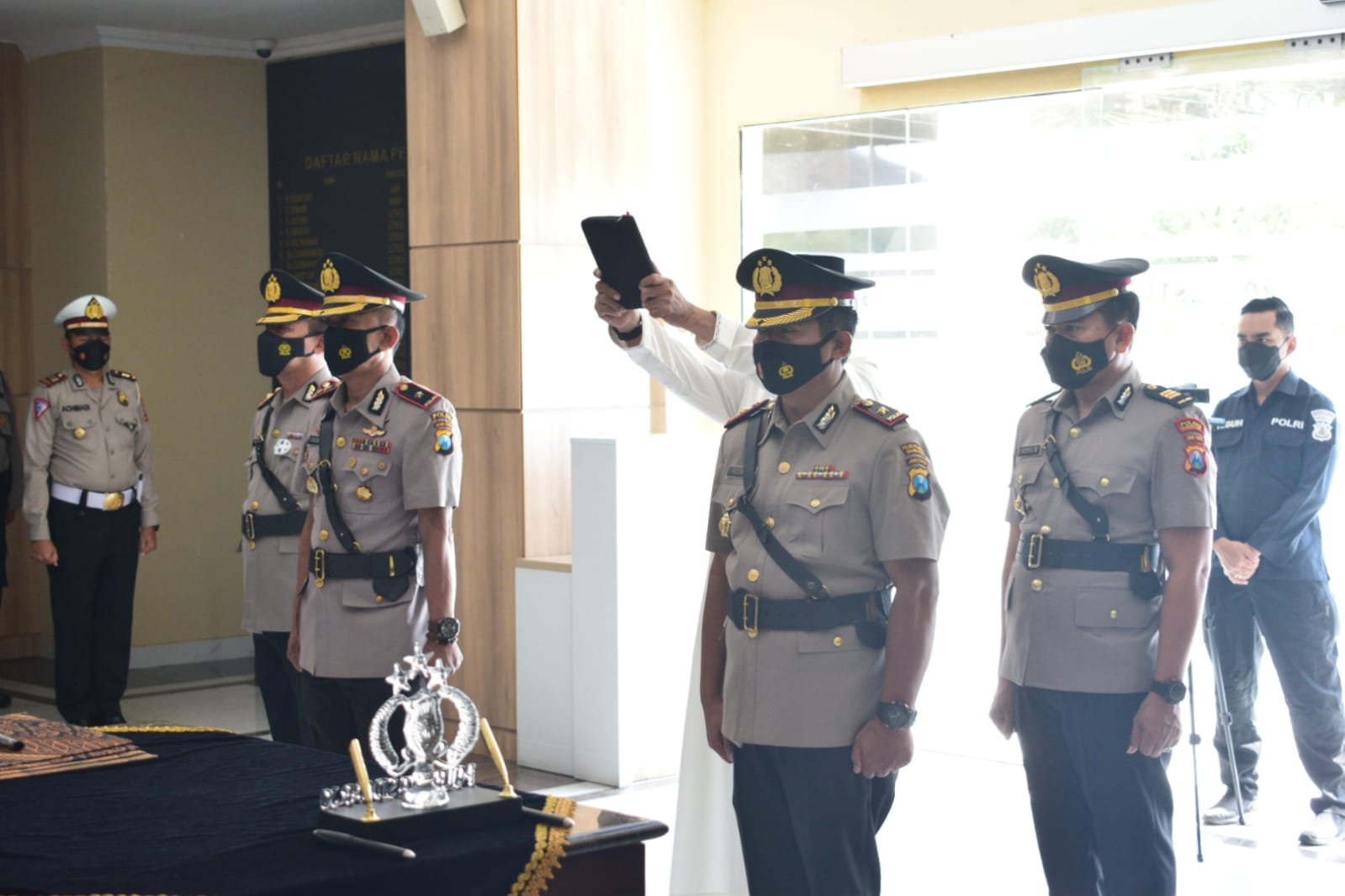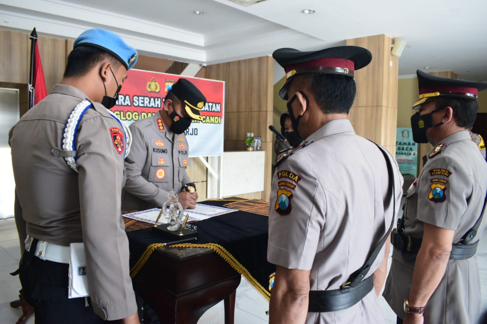 Pejabat Kabag Logistik Polresta Sidoarjo dan Kapolsek Candi berganti. Upacara serah terima jabatan keduanya dipimpin Kapolresta Sidoarjo Komisaris Besar Polisi Kusumo Wahyu Bintoro, Jumat, (29/7/2022) pagi di ruang lobi Mapolresta Sidoarjo.