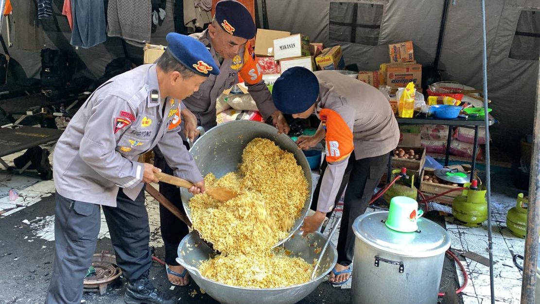 Terlihat sebuah dapur umum terpasang spanduk bertuliskan “ Dapur umum Sat Brimob Polda Jateng “, di situlah Team dari Batalyon B Sat Brimob Polda Jateng mendirikan dapur lapangan, tampak komandan team IPTU. Suwarto bersama beberapa personel Brimob sedang berjibaku mempersiapkan bumbu bumbu dapur, antara lain Cabe, bawang merah dan sejumlah sayuran untuk membuat menu sarapan pagi untuk para pengungsi.