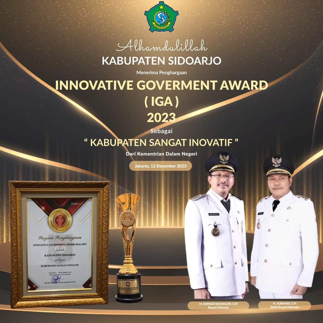Pemerintah Kabupaten Sidoarjo dinobatkan sebagai Kabupaten Sangat Inovatif pada ajang Innovative Goverment Award (IGA) Tahun 2023 oleh Kementerian Dalam Negeri (Kemendagri).