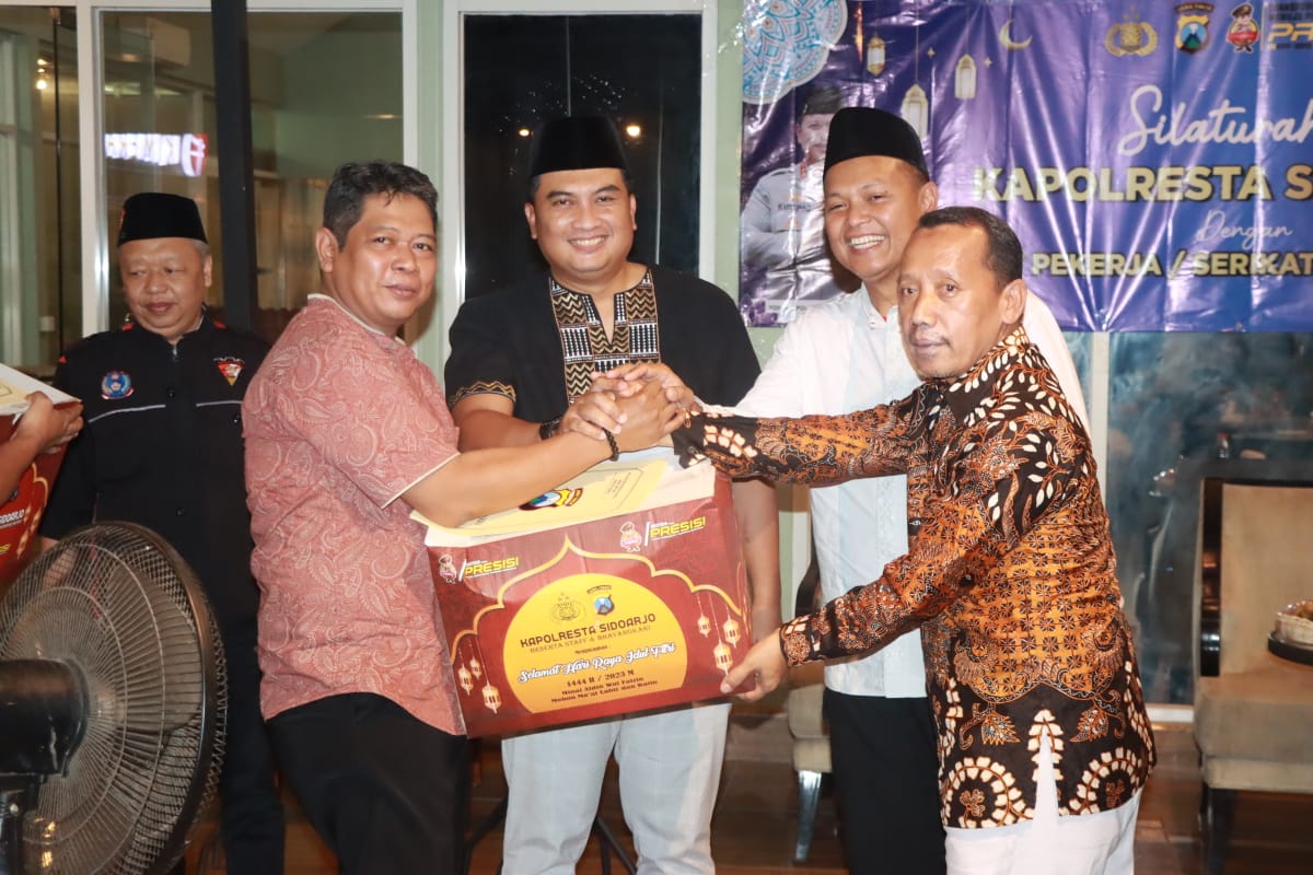 Silaturahmi kamtibmas, Kapolresta Sidoarjo bersama elemen buruh dan serikat pekerja di penghujung Bulan Ramadan ini juga menjadi momen kepedulian Kapolresta Sidoarjo untuk memberikan bingkisan lebaran guna menjaga soliditas sinergitas kedua belah pihak. (Ags/MW)