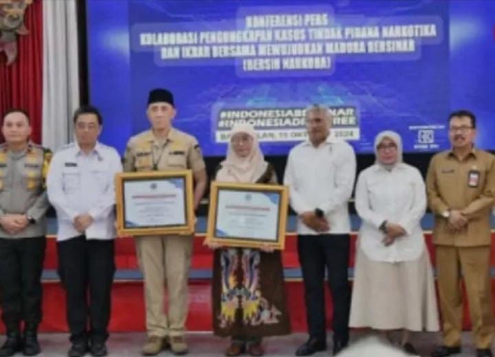 Penghargaan tersebut, di serahkan langsung oleh kepala BBN RI, Komjen pol Martinus hukum, SIK,MSI, kepada plt. Bupati Sumenep, Hj, Dewi Khalifah, SH, MH, MPdi, dalam acara konferensi pers kolaborasi pengungkapan kasus tindak pidana Narkotika dan ikrar bersama mewujudkan Madura Bersih Narkoba (Bersinar) di pendopo Agung Bupati Bangkalan, Selasa (15/10/2024).