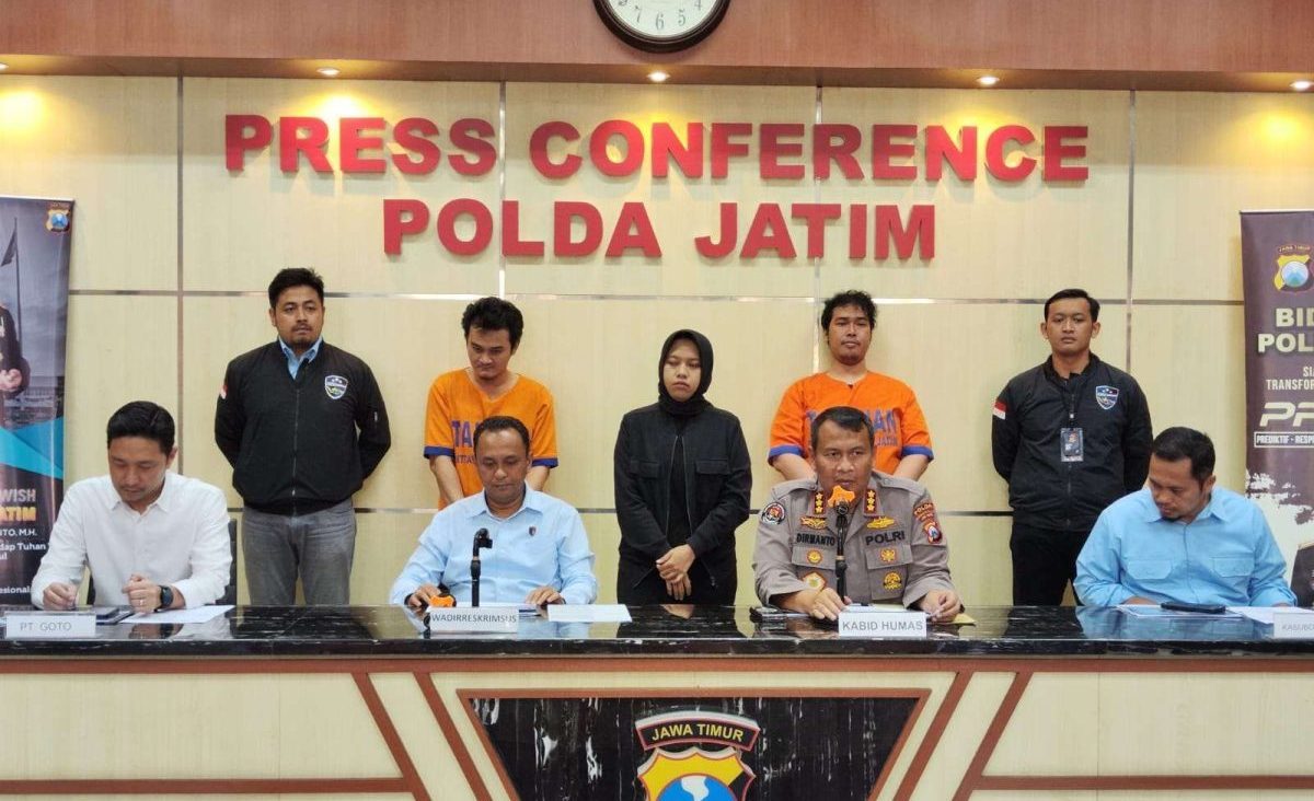 Direktorat Reserse Kriminal Khusus (Ditreskrimsus) Polda Jawa Timur mengungkap penipuan berkedok orderan fiktif menggunakan aplikasi GoFood, Kamis (7/9/2023).