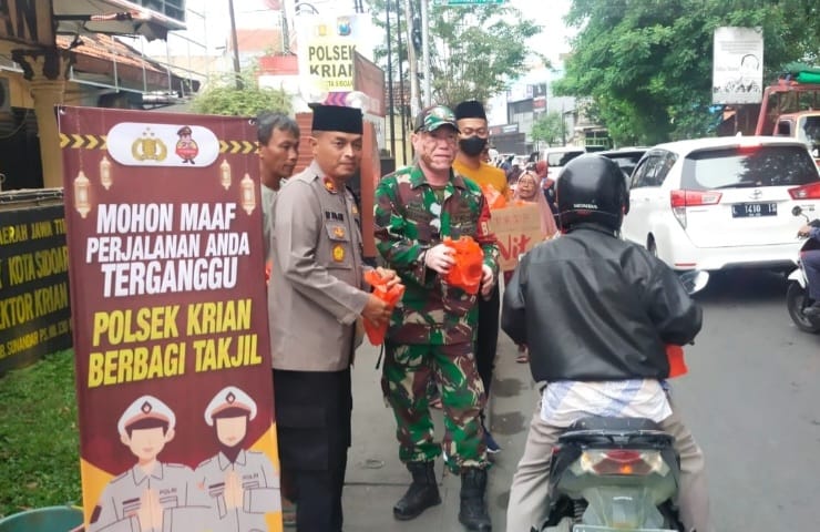 Menjelang detik-detik perayaan Hari Raya Idul Fitri, sinergitas antara Polsek Krian dan Koramil Krian kembali terlihat dalam aksi sosial berbagi takjil gratis bagi masyarakat dan pengguna jalan. Kegiatan yang berlangsung di depan Mapolsek Krian pada Kamis (27/3/2025) sore ini, menjadi bentuk kepedulian bersama menjelang waktu berbuka puasa di hari ke-27 bulan suci Ramadan.