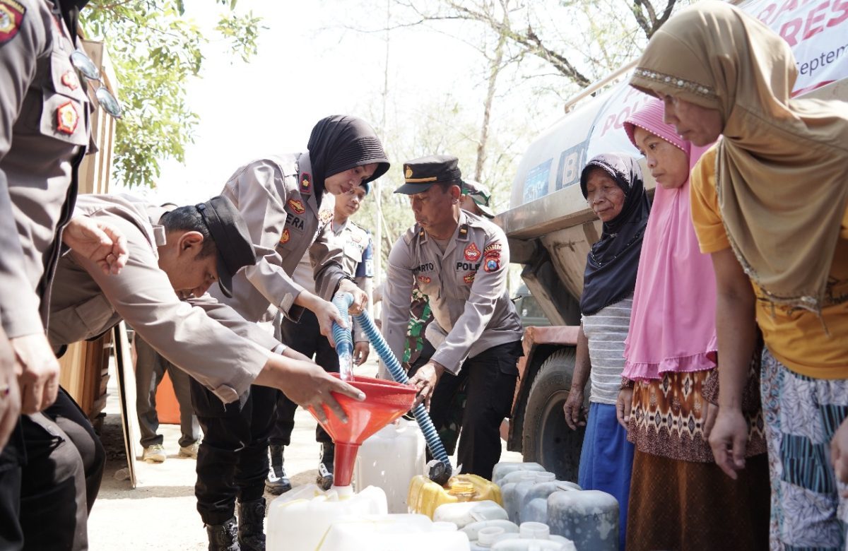 Kekeringan mulai melanda disejumlah wilayah Ponorogo. Kali ini, Polwan Polres Ponorogo menggandeng TNI, BPBD dan Perhutani kembali menyalurkan bantuan dengan Droping air bersih di Jalan Tirto, Panguripan Desa Duri, Kecamatan Slahung, Ponorogo, Kamis (21/9/2023)