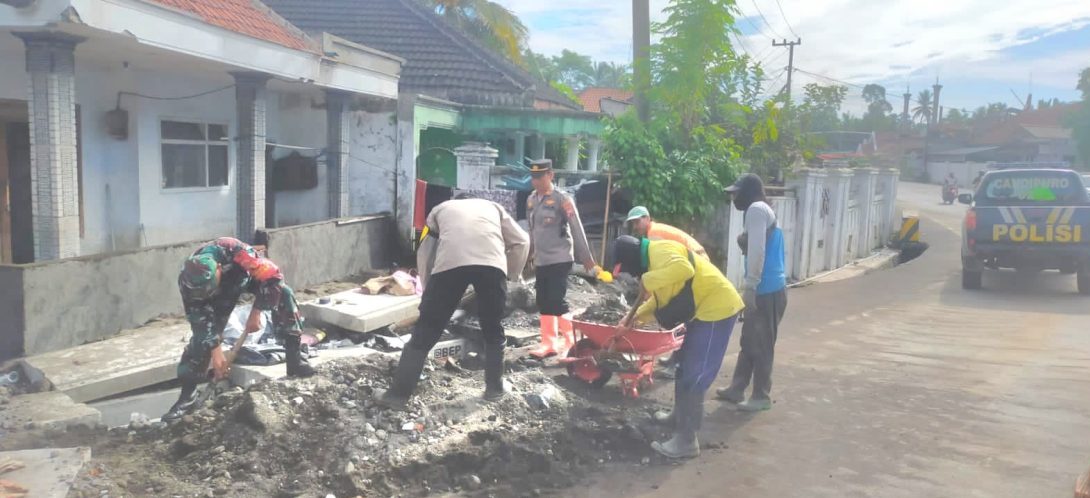 Pasca banjir di Desa Sumberwuluh Kecamatan Candipuro, Kabuten Lumajang itu, TNI – Polri dan warga berjibaku membersihkan gorong-gorong yang tersumbat oleh material banjir.