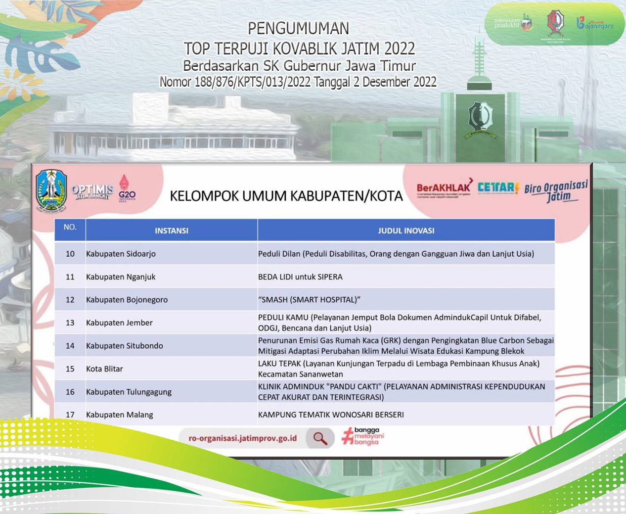 Kabupaten Bojonegoro kembali meraih prestasi membanggakan. Melalui inovasi SMASH (Smart Hospital) yang dikembangkan Rumah Sakit Umum Daerah (RSUD) Sumberrejo, masuk 17 Top Terpuji Kategori Inovasi Umum Daerah di ajang Kompetisi Inovasi Pelayanan Publik (KOVABLIK) Jawa Timur Tahun 2022.