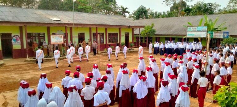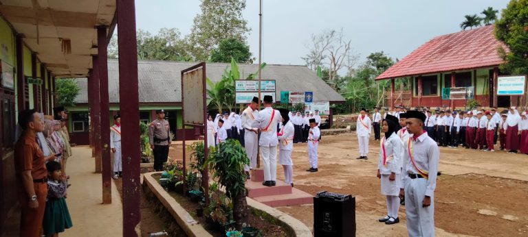 Sekolah SMPN Satu Atap (Satap) 1 dan SDN 4 Datar lebuay, Kecamatan Air naningan, Kabupaten Tanggamus Provinsi Lampung adakan kegiatan rutinitas upacara setiap hari senin di halaman Sekolah, Sabtu, (04/08/2023).