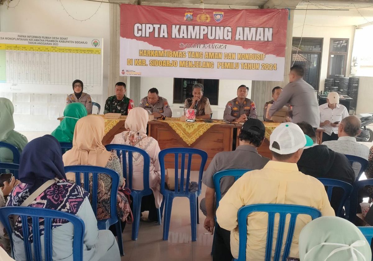 Polresta Sidoarjo melalui Wakasatbinmas AKP Yogi bersama timnya menggelar kegiatan sosialisasi “Kampung Aman” menjelang pemilihan umum 2024. Acara ini berlangsung di Balai Desa Wonoplintahan, Kecamatan Prambon, Kamis, 2/11/2023, dimulai pukul 10.00 Wib hingga selesai, dan turut diisi dengan sesi tanya jawab oleh para audensi yang hadir.