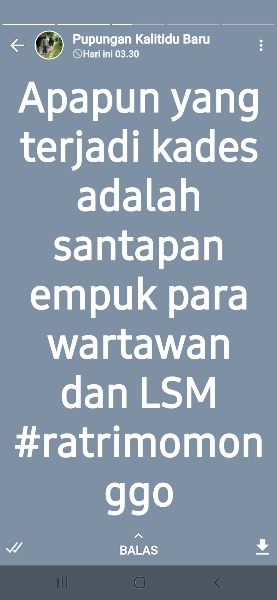 Salah satu tulisan Story tersebut, yakni, “apapun yang terjadi, Kades adalah santapan empuk Wartawan dan LSM” #ratrimomonggo.